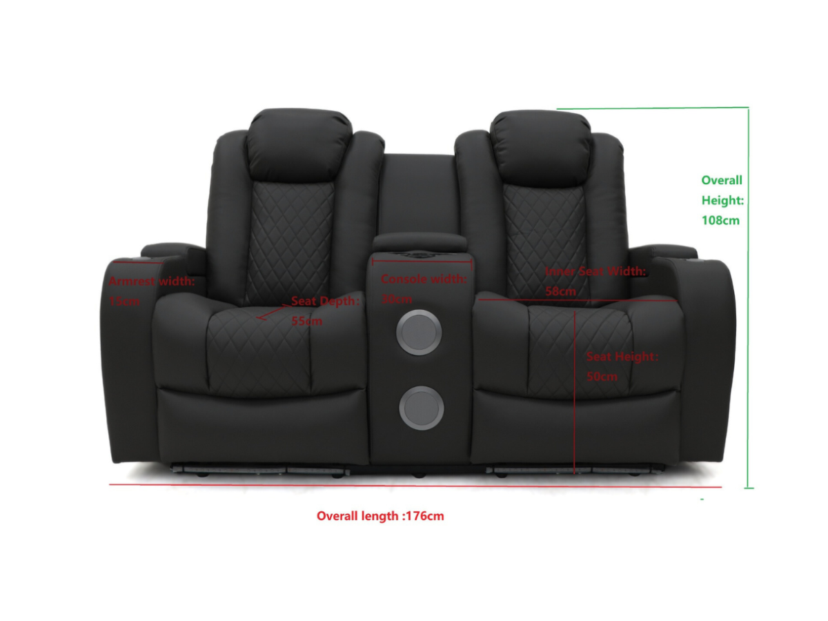 Revolutionise your living space with the Tech 8 Smart 2 Seater Electric Recliner Sofa, where luxury meets cutting-edge technology. This premium leather recliner sofa transforms your home entertainment experience with innovative features designed for ultimate comfort and immersion. Engineered for movie enthusiasts and relaxation seekers, this 2 seater electric recliner sofa offers a cinema-like experience right in your living room. Customise your comfort with multi-position reclining, built-in vibration massage, and heating functions that ensure you're always in the perfect relaxation mode. Experience unparalleled comfort and technology with the Tech 8 Smart 2 Seater Electric Recliner Sofa.
