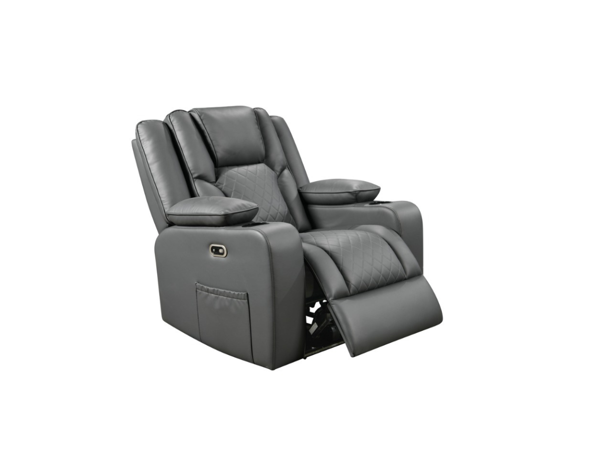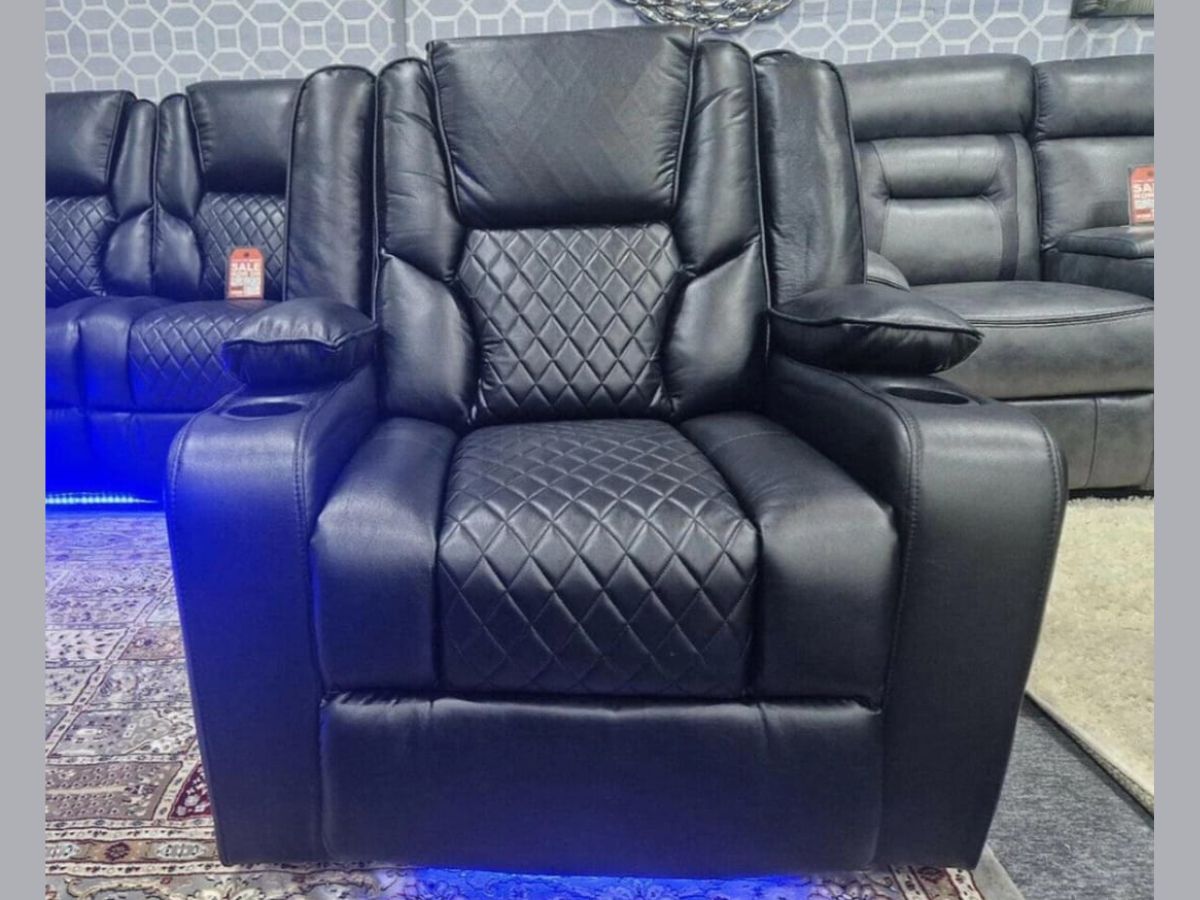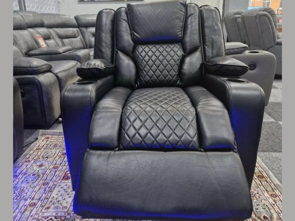Discover the Orlando Electric Recliner Armchair, a blend of comfort and sophistication. Crafted from premium Aire leather with elegant diamond quilting, this recliner features an electric reclining mechanism and convenient built-in USB ports. Enhance your space with LED base lighting and an integrated cup holder for your beverages. With a reinforced frame for durability and support, transform your living area into a stylish haven with the Orlando Electric Recliner Armchair.
